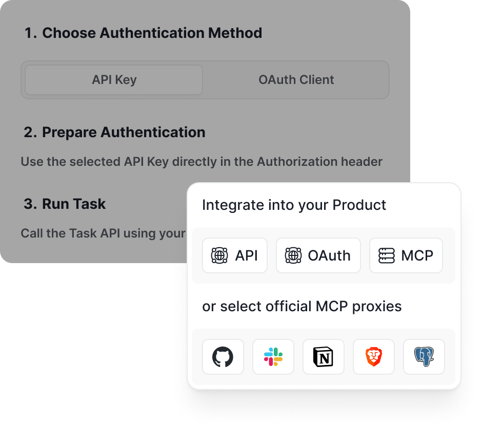 Embed into existing stack via API or MCP.