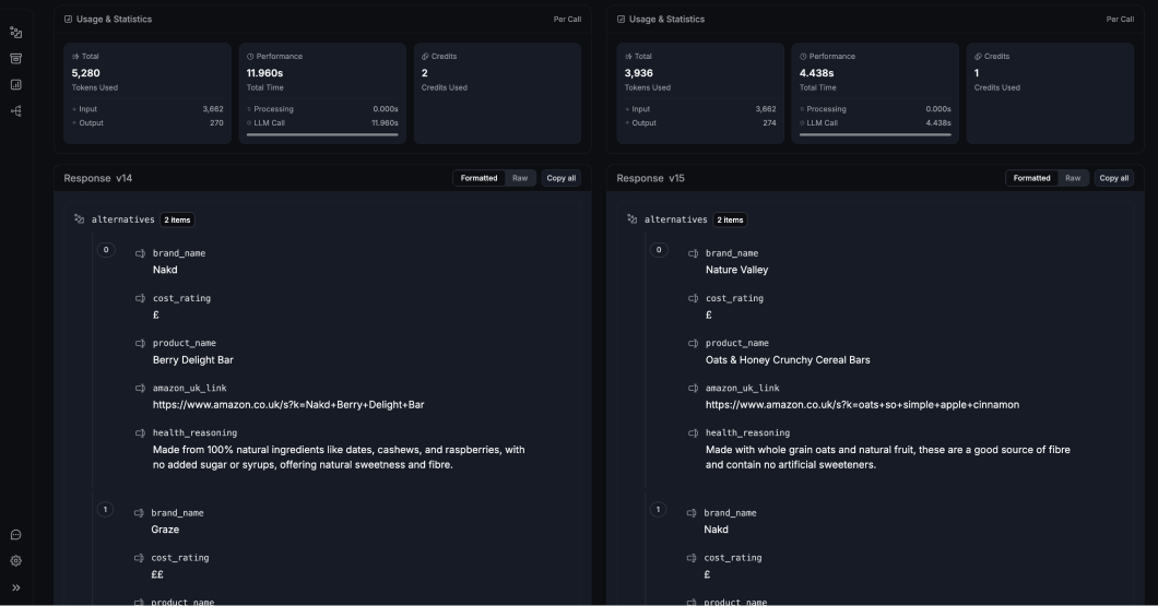 Because SmartShop lives on Rightbrain, the Pal. team can quickly adjust prompts and ship improvements instantly by promoting versions to staging and production. Version control allows them to experiment without impacting users.