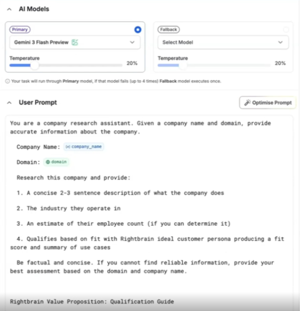 The Rightbrain agent is configured to use the domain and company name to research and qualify the account.