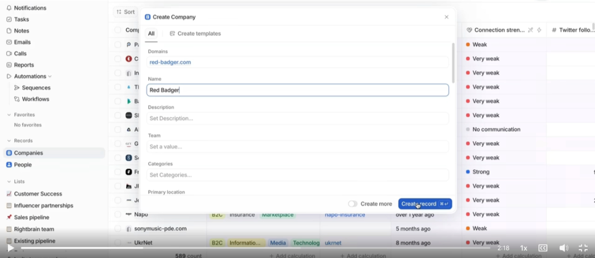 A new company record is created in Attio, either manually, through a website form, or a csv upload. This usually contains: