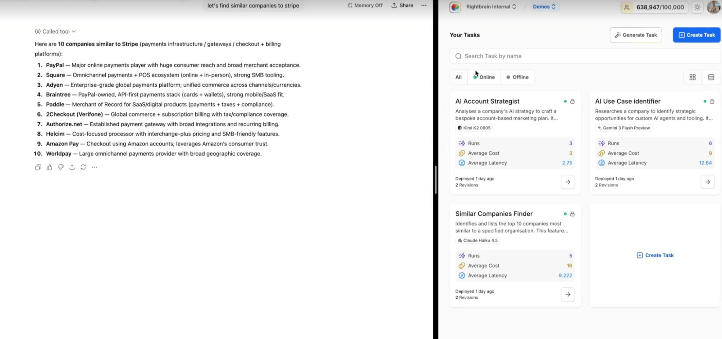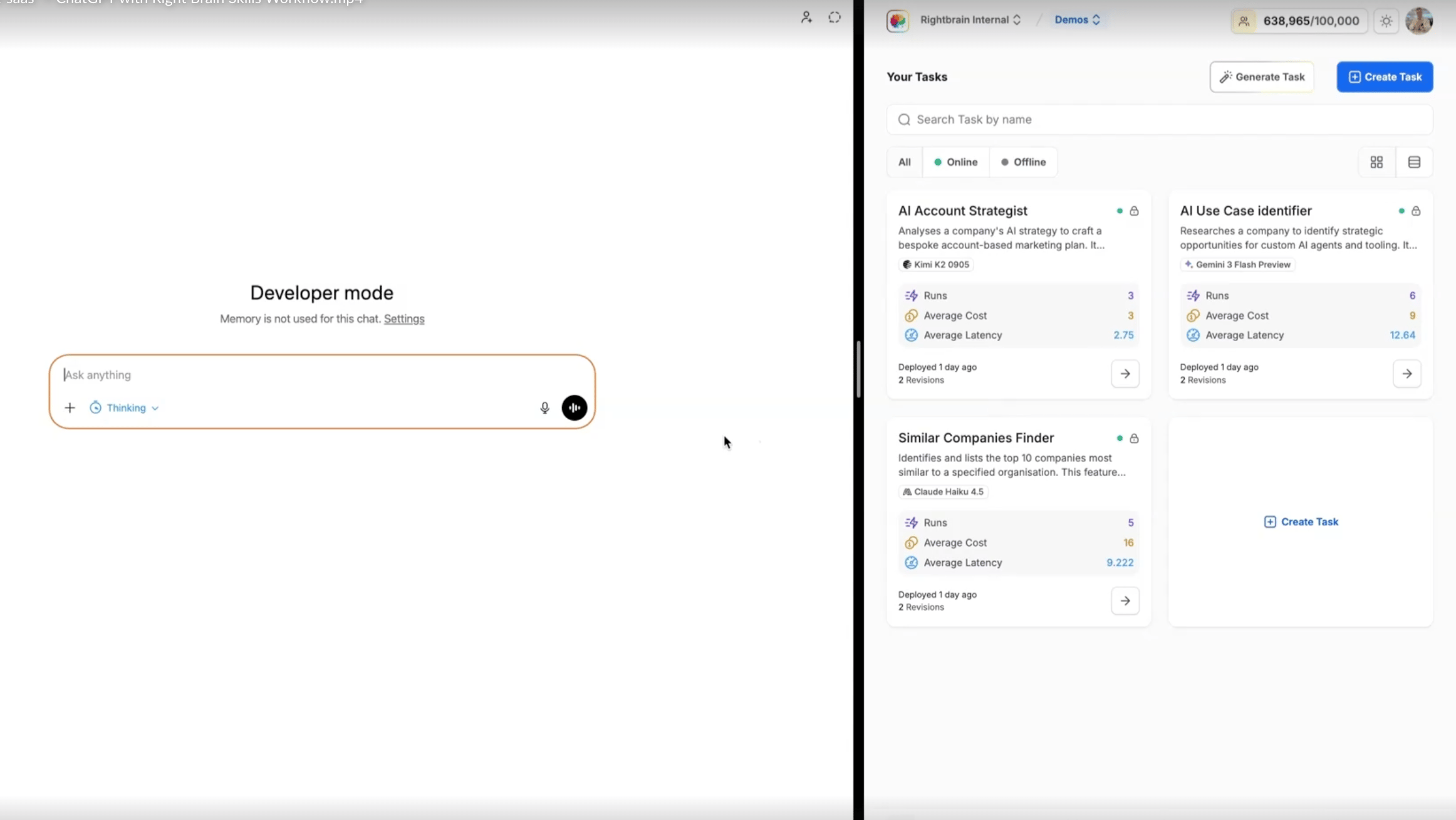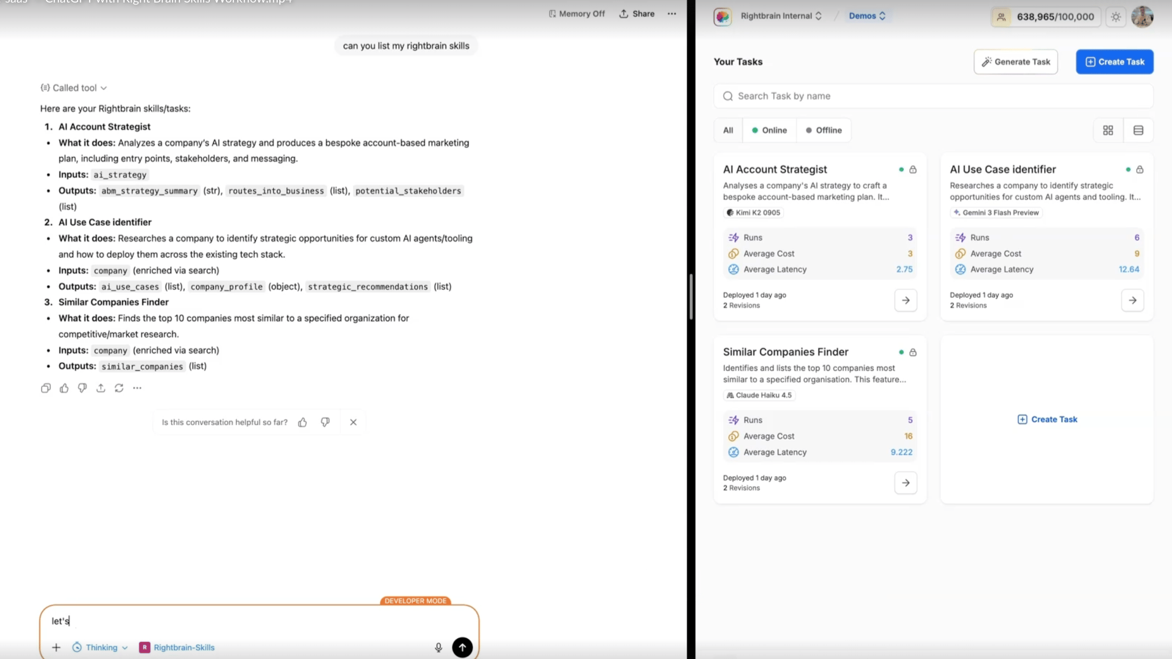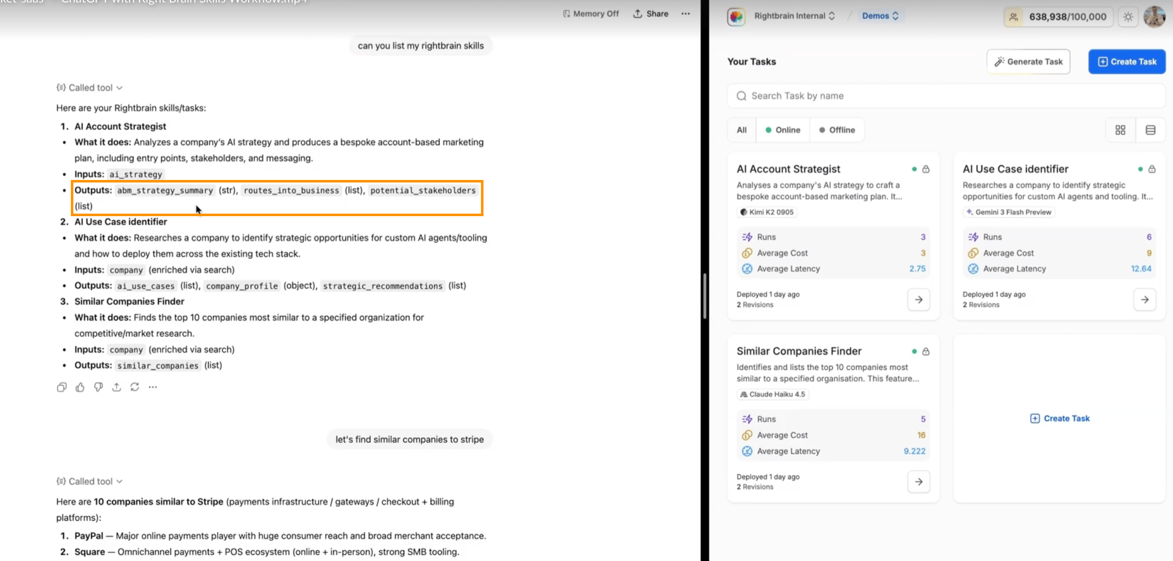 At the same time, these Skills are visible within the Rightbrain dashboard, confirming that the interface and the execution layer are fully synchronised.