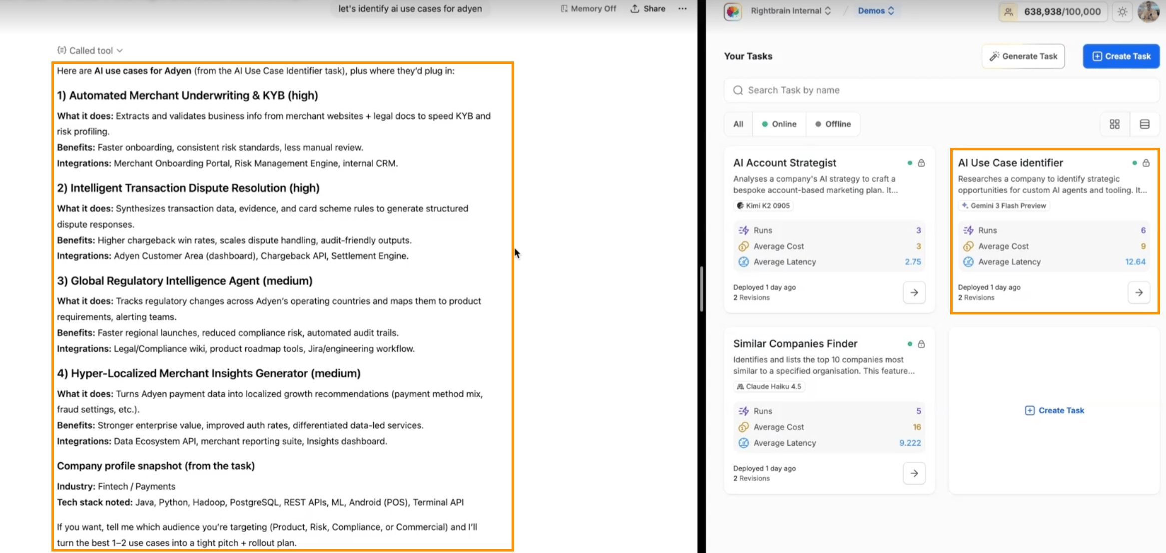 This Skill researches the company in the context of Rightbrain’s services and capabilities. It then produces a set of tailored ideas for how Rightbrain could engage with that organisation. The output is structured as a ranked list of use cases based on relevance and potential impact.