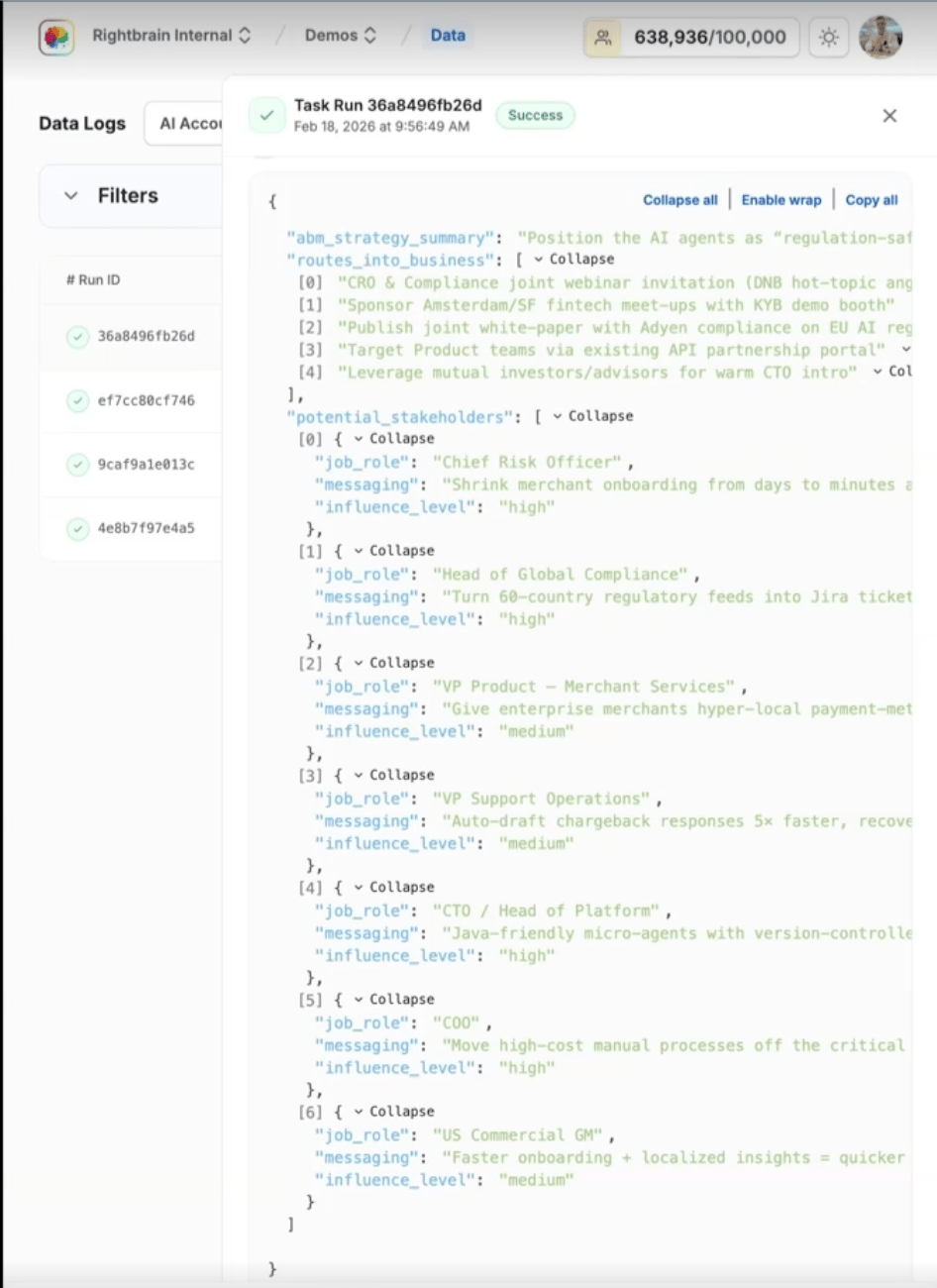 As ChatGPT calls the Account Strategist Skill, the logs update in near real time, confirming that the Rightbrain API has been triggered and the task is running as expected. Users can open an individual run to review detailed metrics, including duration, token usage, cost, raw inputs, and the full JSON response.