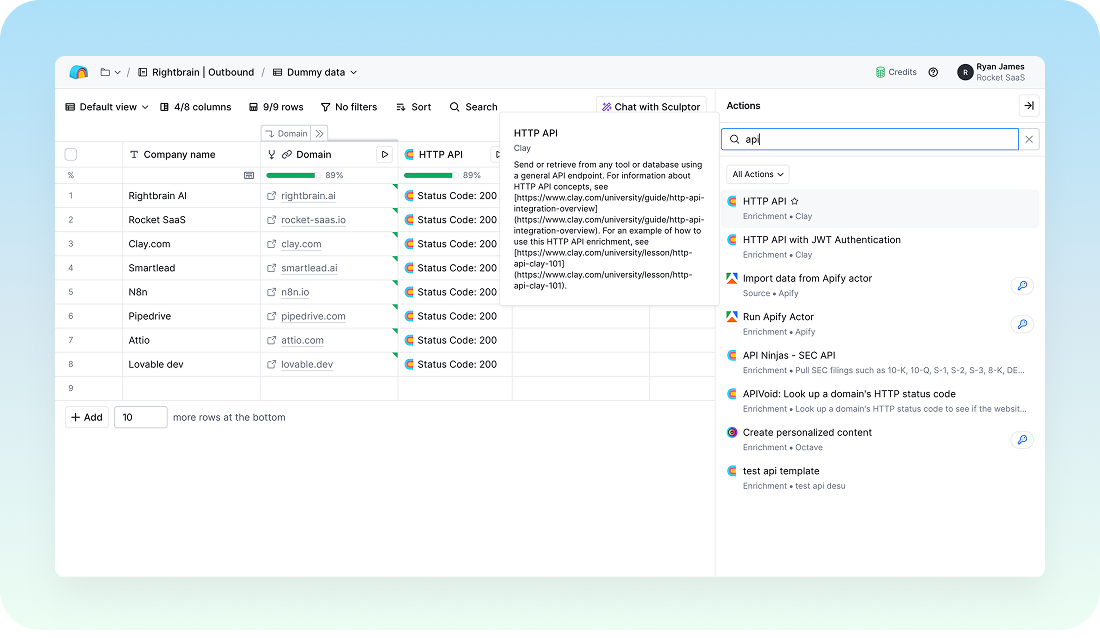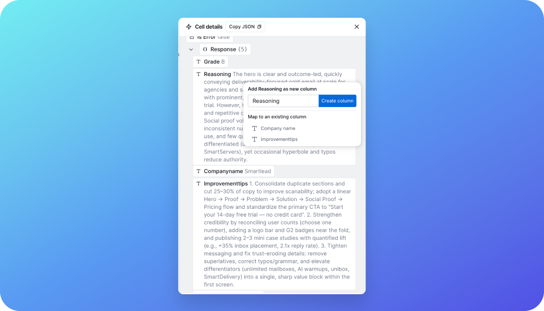 Finally, map the various outputs from Rightbrain into a structured table within Clay, making the results easy to read and actionable.