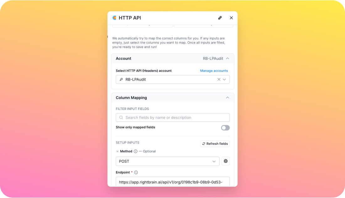 Start the process by using Clay’s HTTP API Enrichment to call Rightbrain’s API. This triggers the audit process, connecting the website data for evaluation.