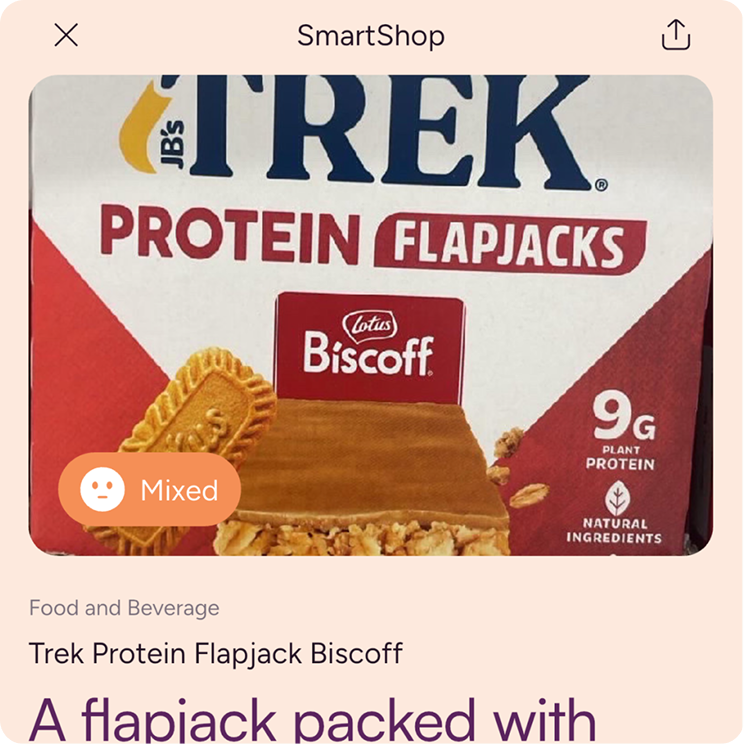 One of Pal’s features, SmartShop, is a health product scanner that helps users make better choices in the supermarket. When a user takes a photo of a product, SmartShop: